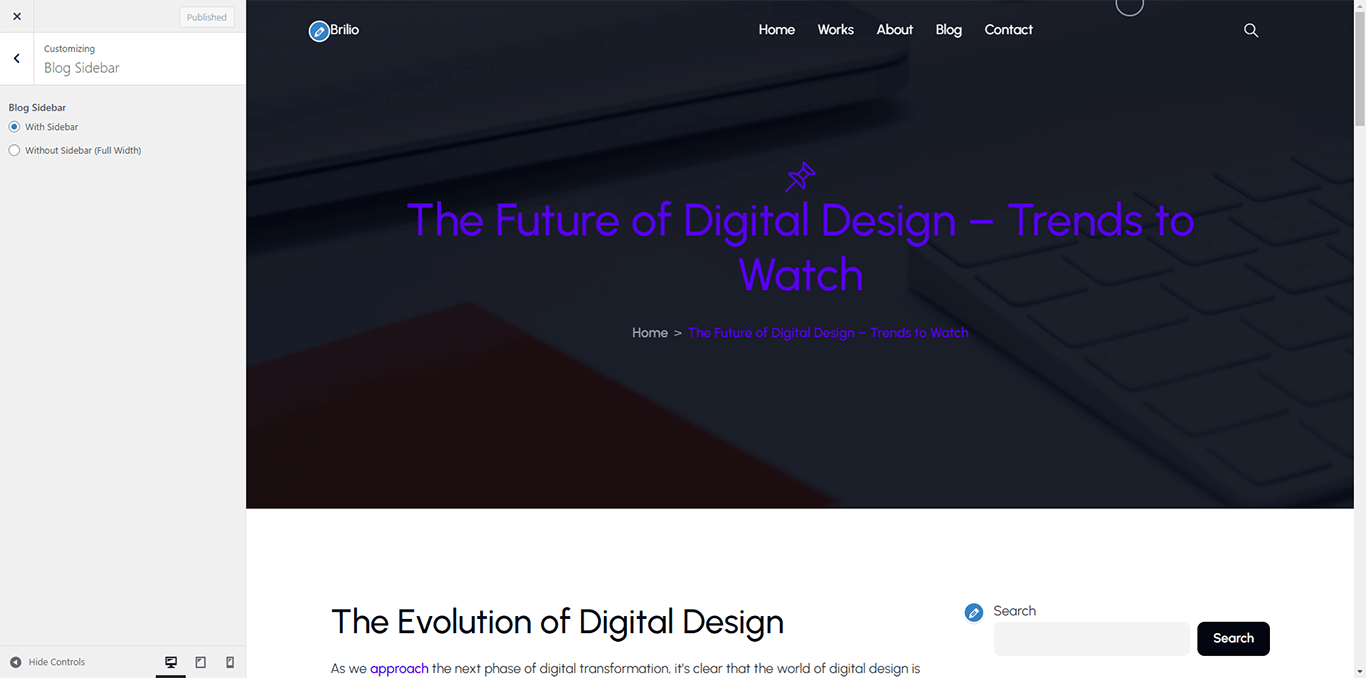 Here you can configure the layout of your blog sidebar. Adjust the Blog layout among the available options. The container has 2 layout options: With Sidebar and Without Sidebar (Full Width).