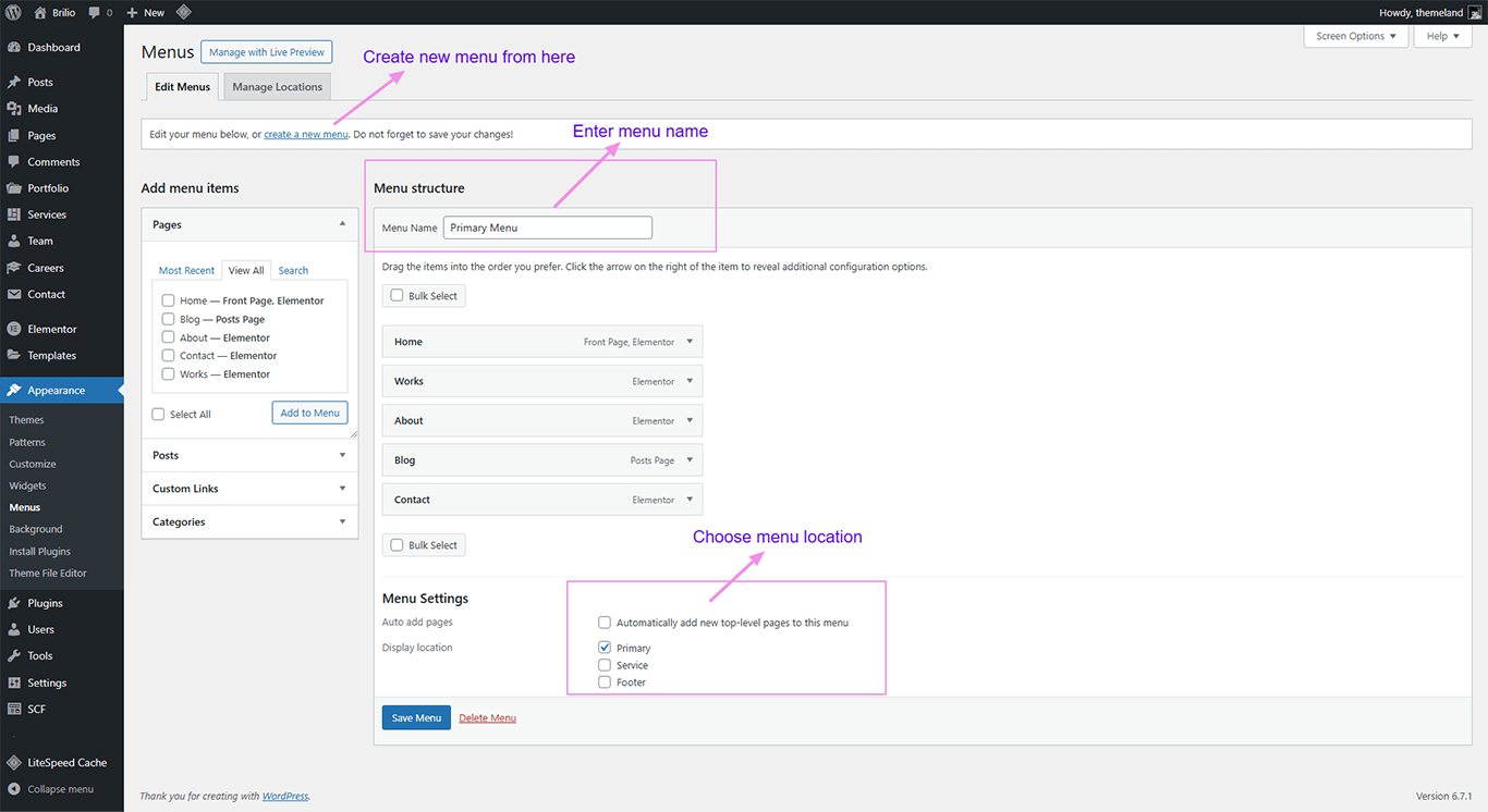 - Set display location in menu settings as Primary and click on Save Menu button.
