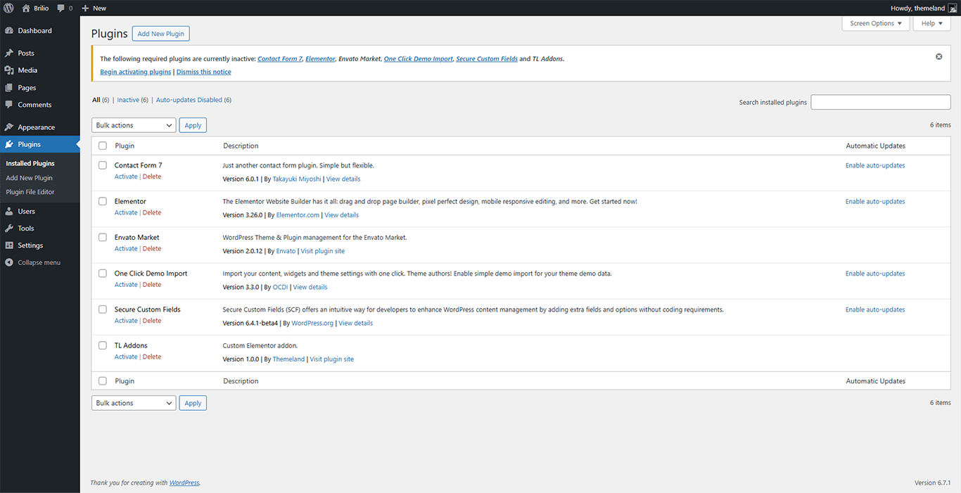 Brilio requires a set of core and additional plugins to function correctly. A plugin is an additional component that offers functionality and features beyond a typical WordPress installation. Without them, most of its functionality is not available. After installing the theme you will be prompted to install the required plugins at the top of your dashboard.